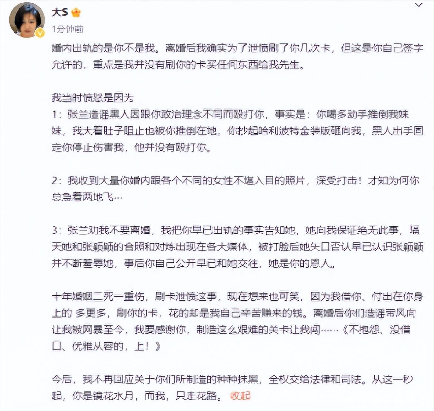 当时网上还有张颖颖和张兰的合照,估计也把大S气够呛。后面大S发声十年婚姻二死一重伤里,也提及张兰早就知道汪小菲与张颖颖在一起。